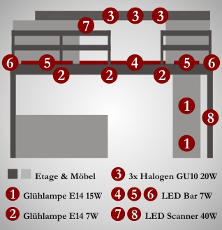 Für die Umsetzung der Strategie werden ins- gesamt knappe 40 DMX-Kanäle benötigt. Das sollte das Lichtpult verkraften.
